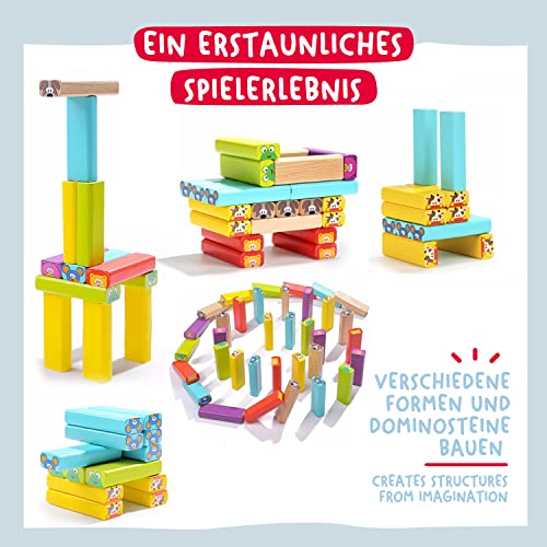 🦁 4 SPIELE IN 1: Dieses lustige Brettspiel für Kinder und Erwachsene ist nicht einfach nur ein weiterer Turm. Es gibt 4 verschiedene Variationen, die Sie mit der Familie genießen können: 1) Bauen Sie den Turm und benutzen Sie die Würfel, um herauszufinden, welchen Block Sie verwenden sollen. 2) Verwenden Sie die Tierkarten anstatt die Würfel, um die Blöcke zu erraten und entfernen. 3) Verwirklichen Sie kreative Konstruktionen. 4) Kreieren Sie eine Dominokette