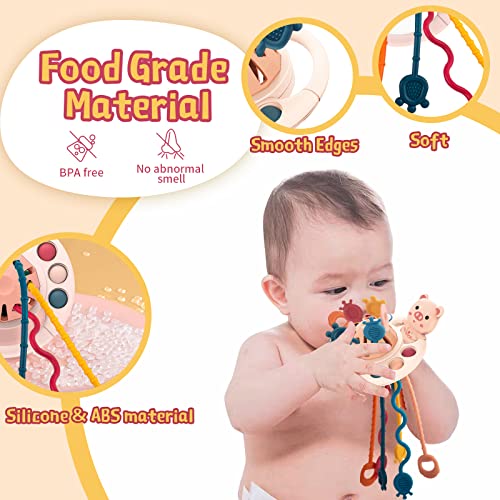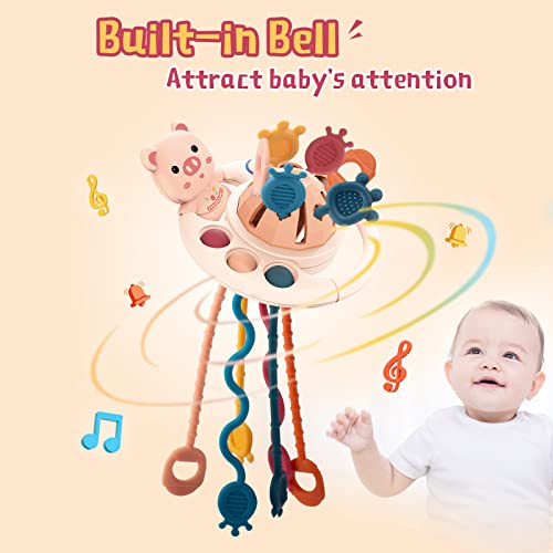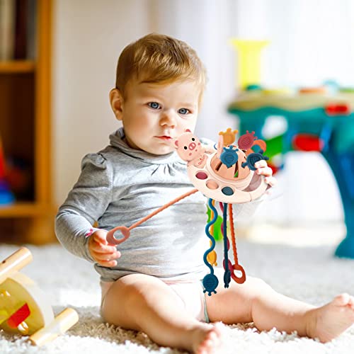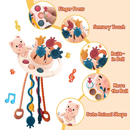 VICMILE Montessori Toys for Babies Food Grade Silicone Pull String Activity Sensory Toys Early Development Toys for Travel, Infants, Toddlers Boys and Girls 18M+ (Pink Pig)